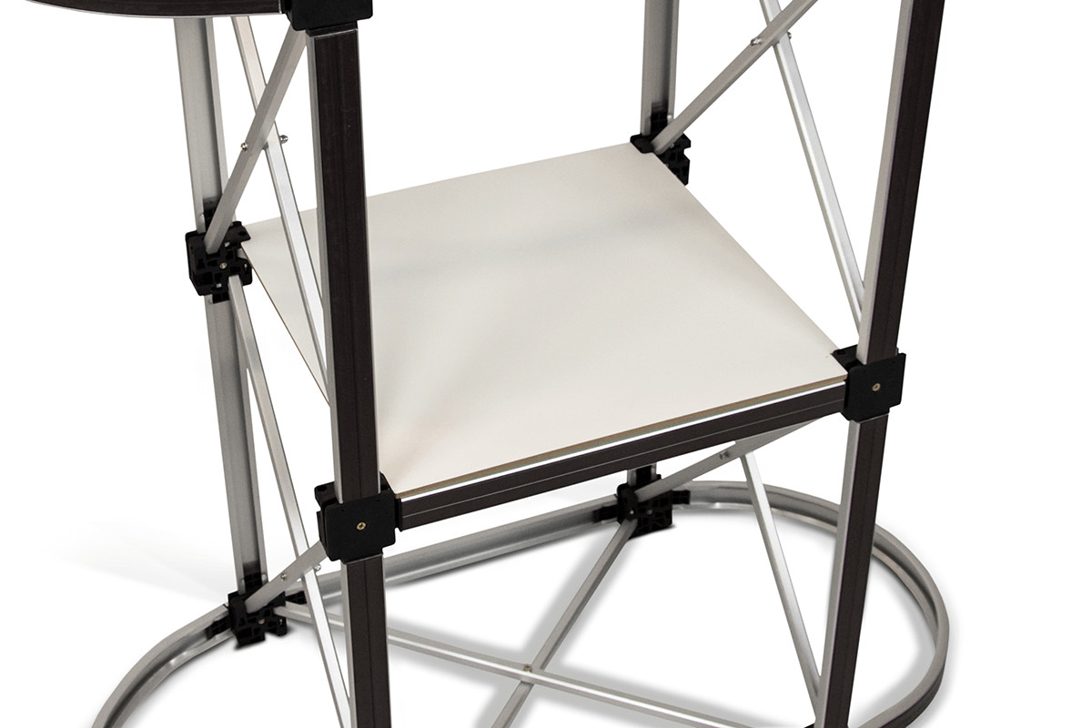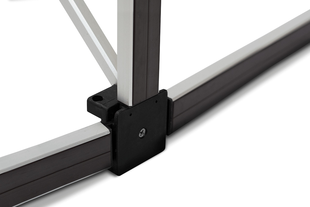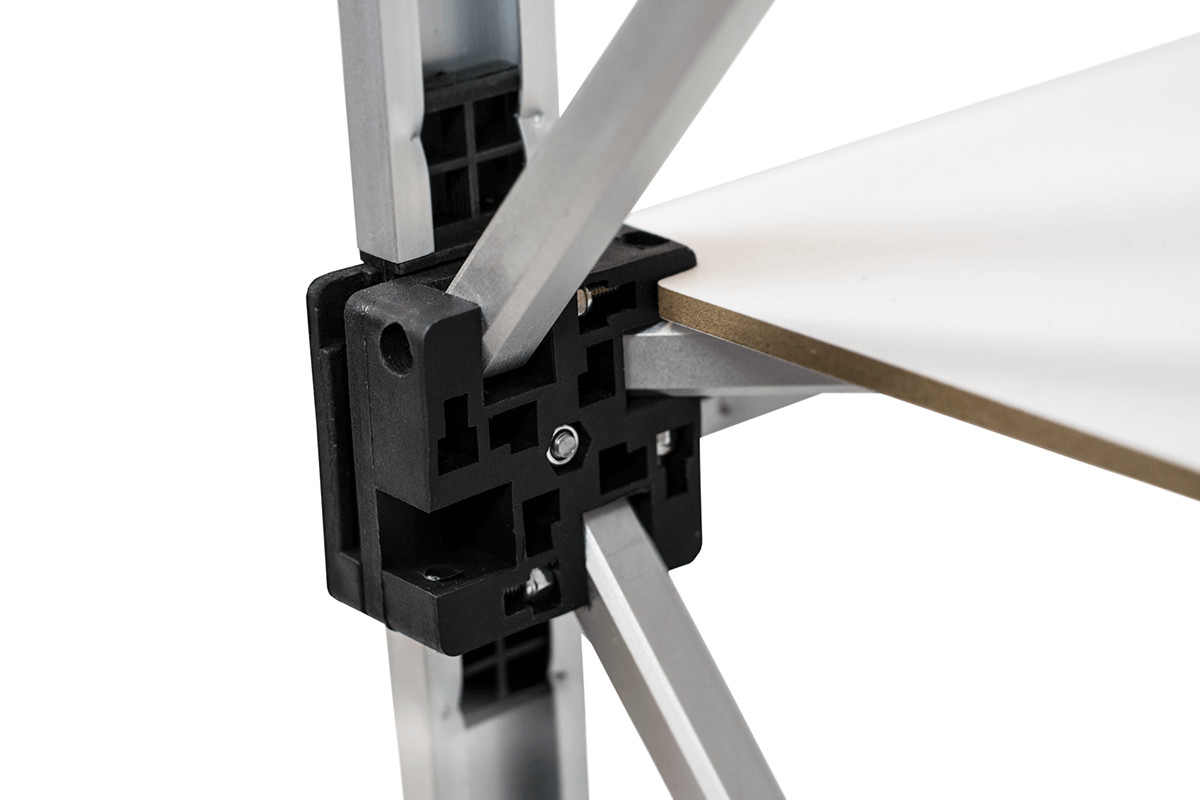Konstrukce je pevná a stabilní, což zaručuje spolehlivé použití i během náročných akcí. Odolná pracovní deska z MDF poskytuje dostatek prostoru pro prezentaci produktů nebo marketingových materiálů. Grafika se k rámu připevňuje pomocí magnetických pásků, což umožňuje rychlou instalaci a čistý, profesionální vzhled.