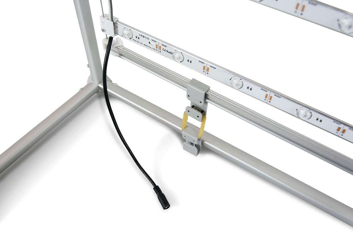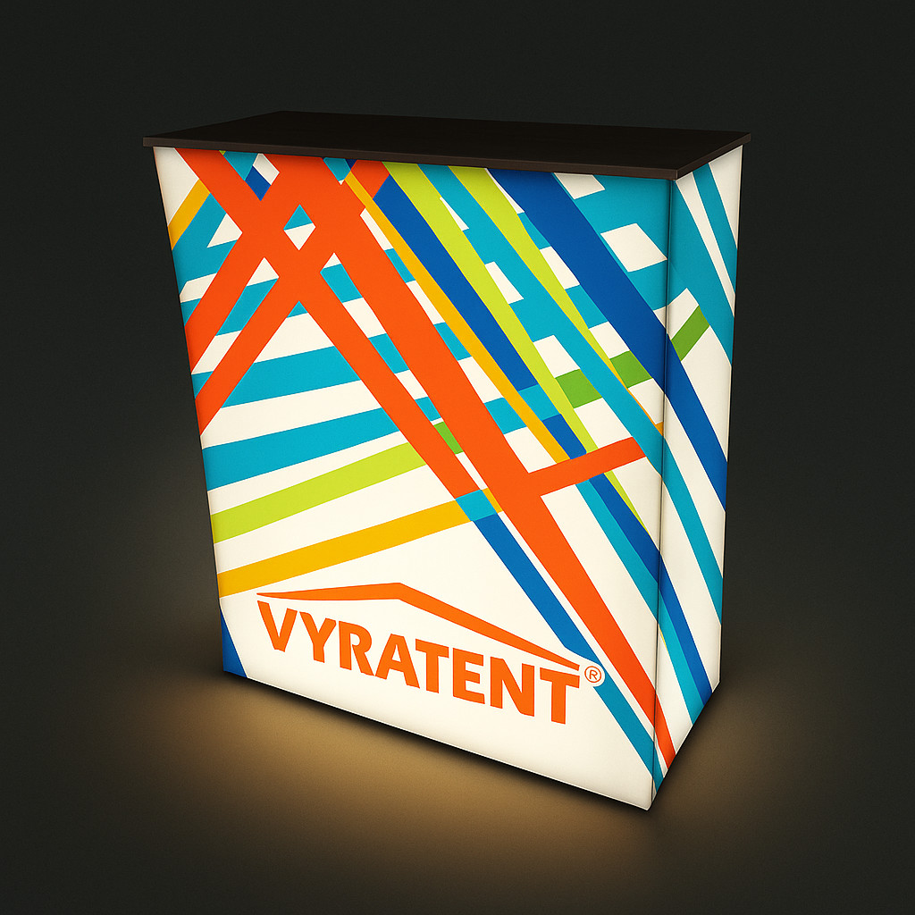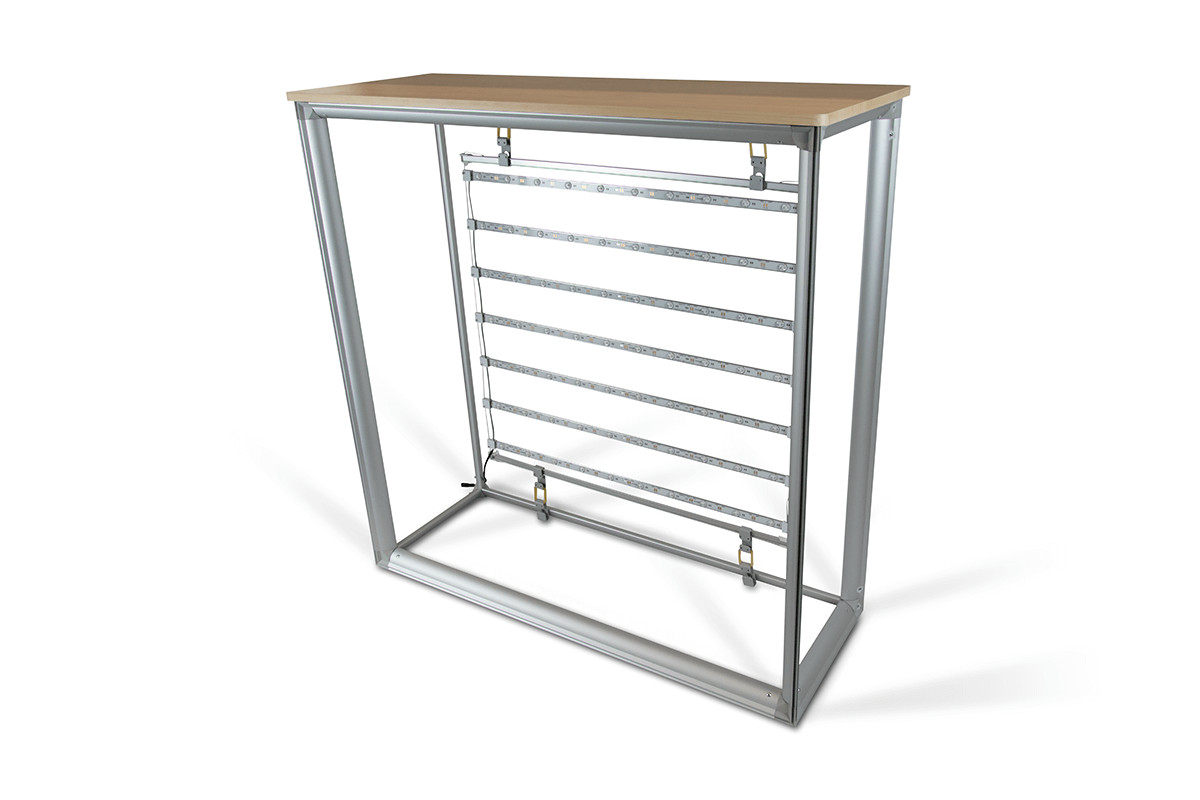 LED hranatý obdelníkový stůl je tvořen konstrukcí z masivních hliníkových profilů, které zajišťují mimořádnou stabilitu. Grafika je vytištěna na polyesterovém materiálu a uchycena k pultu pomocí silikonového lemu. Horní i spodní deska jsou vyrobeny z MDF, LED podsvícení pomocí závěsného panelu.