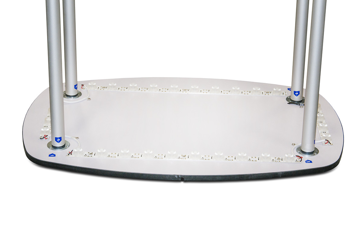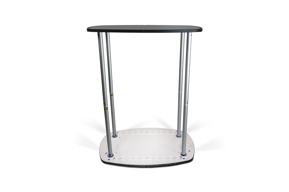 Pomom stůl LED ovlálný je lehký, přenosný pult, jehož konstrukci tvoří tři hliníkové trubky spojující horní desku se základnou. Horní i spodní deska jsou vyrobeny z MDF. Grafika je vytištěna na polyesterovém materiálu a upevněna k pultu pomocí silikonového lemu + LED panel pro podsvícení.