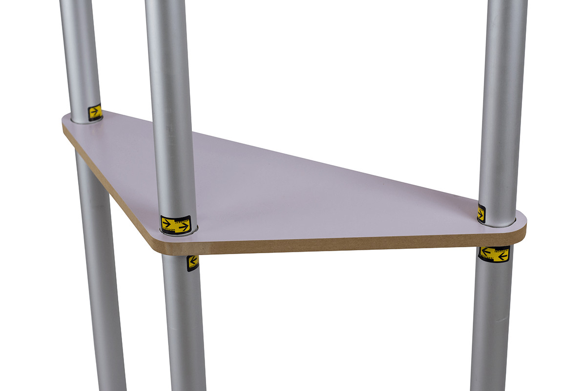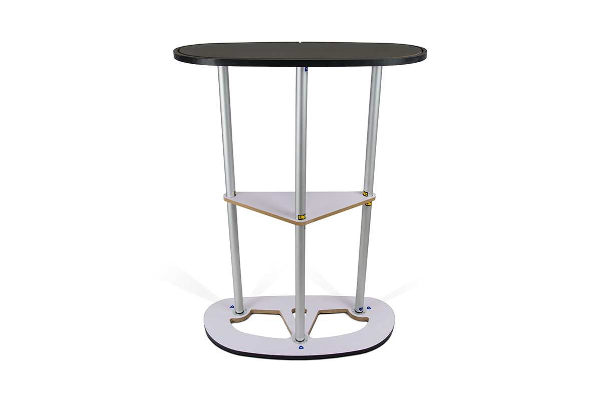 Lycra stůl oválný je lehký, přenosný pult se třemi hliníkovými trubkami, které podpírají horní desku na základně. Horní deska i základna jsou vyrobeny z MDF. Grafika je natištěna na polyesterovém materiálu a ke konstrukci pultu je připevněna pomocí silikonové pásky.